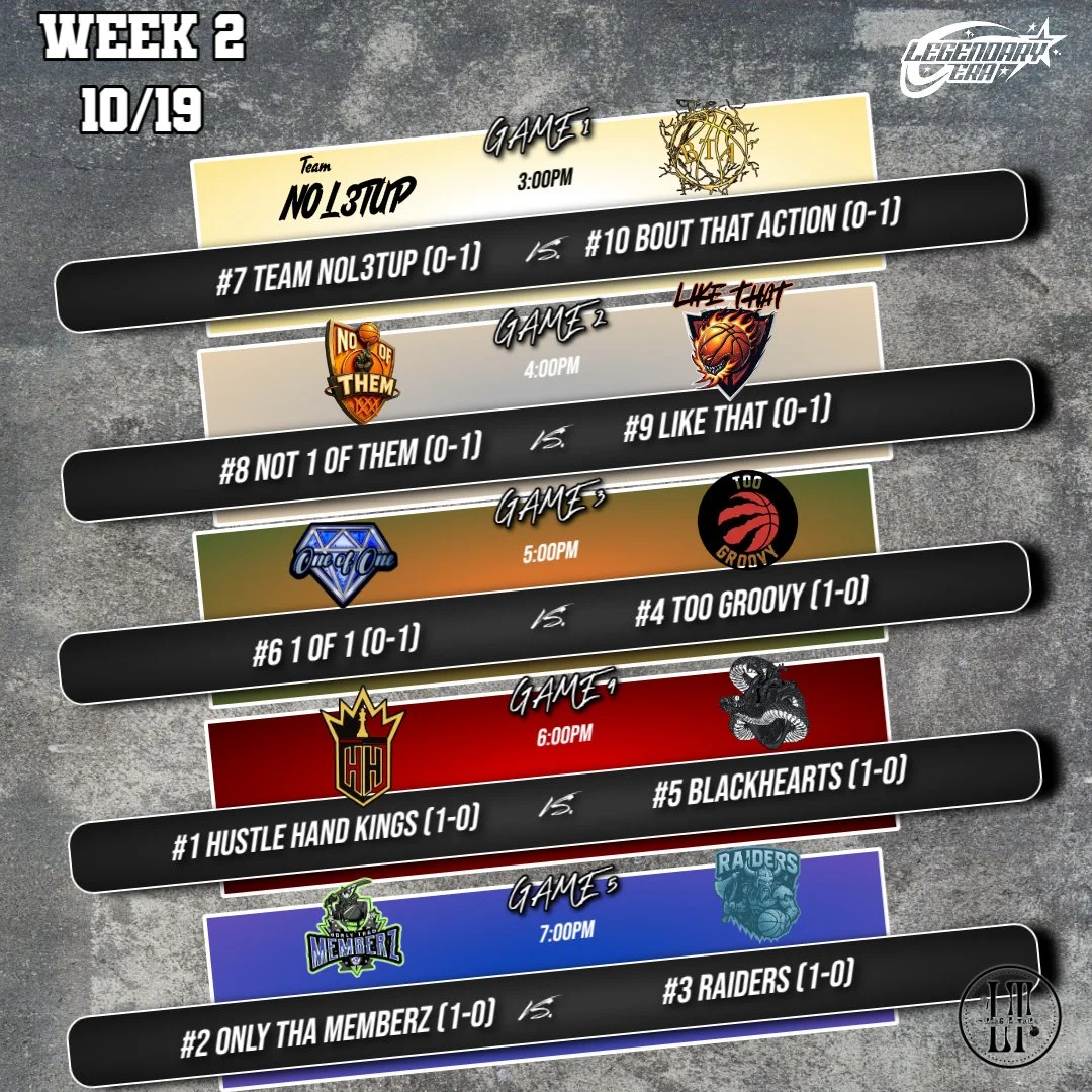 tickets Singe Game Tickets (10/19) $6.00 1) 3:00PM #7 Team NoL3tUp vs #10 Bout That Action 2) 4:00PM #8 Not 1 Of Them vs #9 Like That 3) 5:00PM #6 1 Of 1 vs #4 Too Groovy 4) 6:00PM #1 Hustle Hand Kings vs #5 BlackHearts 5) 7:00PM #2 Only Tha Memberz vs #3 Raiders Purchase Added! Week 2 All Day Pass (10/19) Sale Price: $15.00 Original Price: $20.00 Sale Purchase Added!
